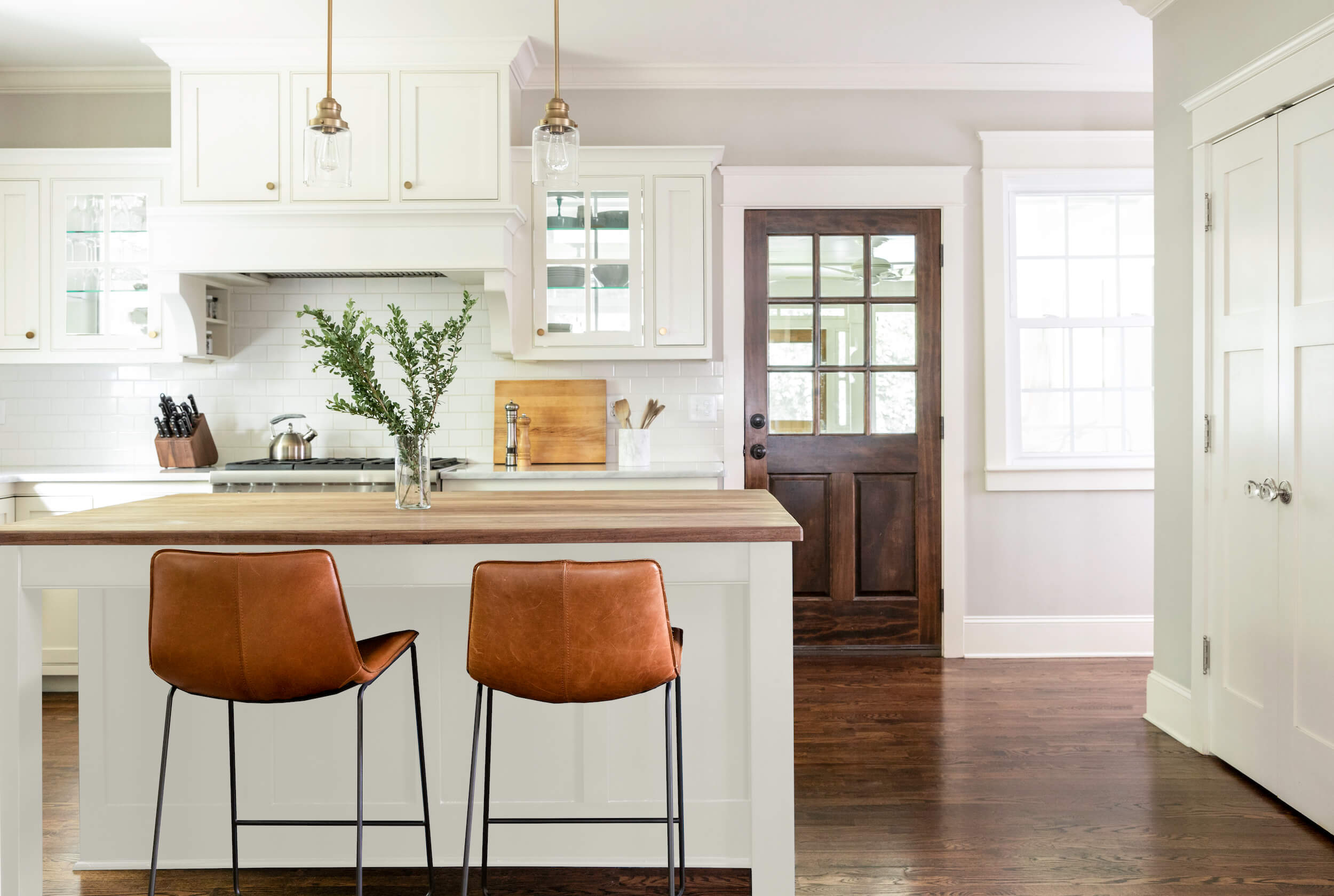 To complete the transformation, we incorporated a custom hood and floating white oak shelves for a modern, natural touch. The cabinetry was finished in a striking combination of N-Hance Pure White and Behr Limousine Leather, adding contrast and elegance to this refreshed, contemporary kitchen.