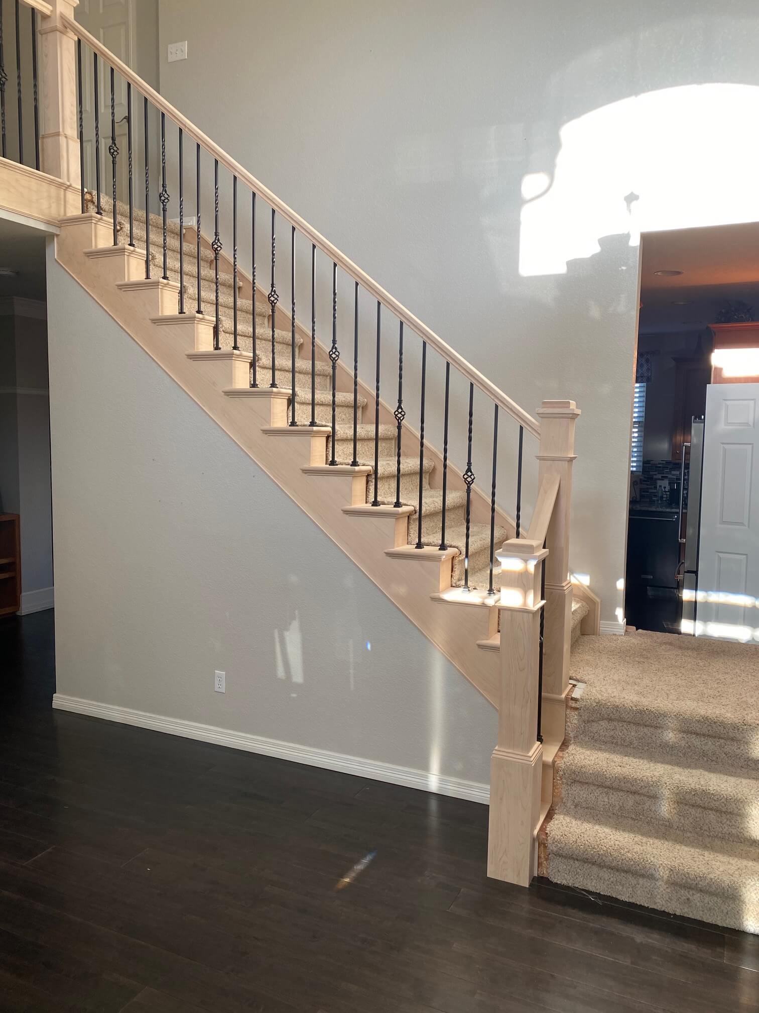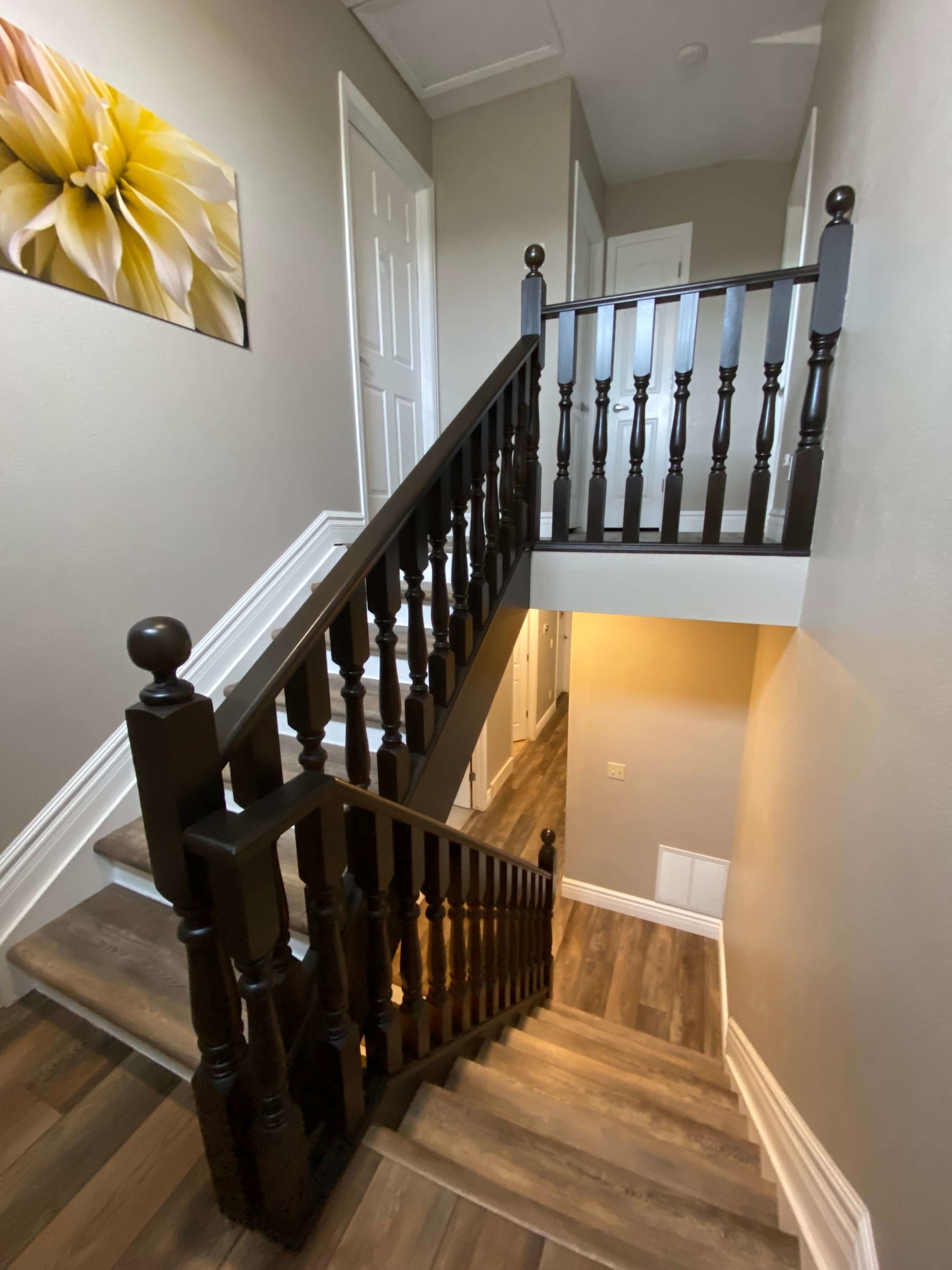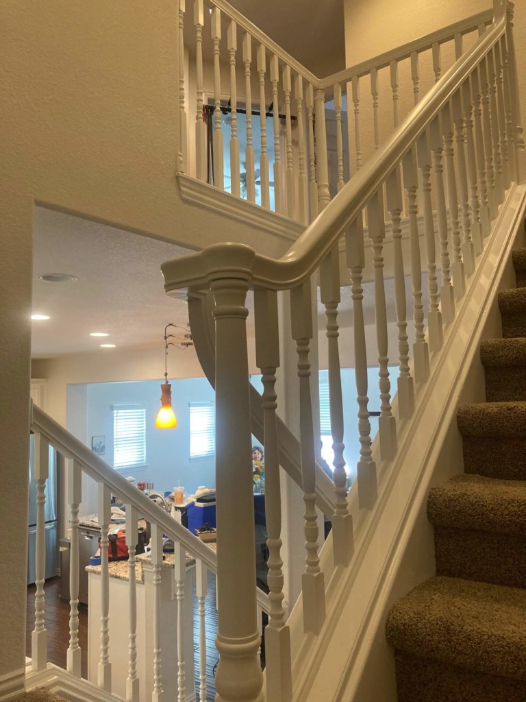 We refinished this banister in a home in Broomfield. We completed everything in 4 1/2 days in white with a nice mocha color for the handrails.