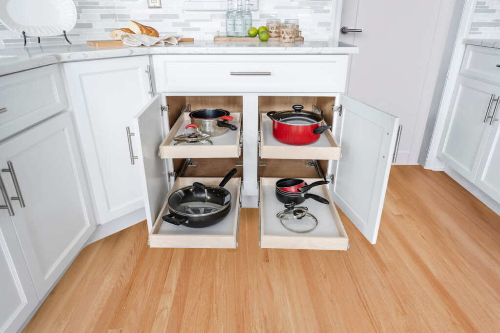 This kitchen was ready for an upgrade! The oak cabinets were giving the kitchen a dated look and the customer was in need of a solution to maximize space in their lower cabinets. New modified shaker style doors finished in N-Hance Bridal Train, top coated with our UV finish gave this kitchen a beautiful new look. The addition of slow close hinges, slow close drawer boxes, and slow close rolling shelves in the lower cabinets gave this kitchen all the functional updates it needed too!