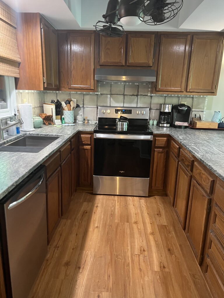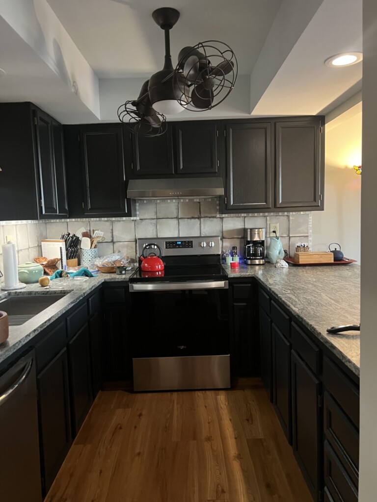 We revamped the cabinets of this Airbnb in Lake Lure, NC. The cabinets had a lot of wear and tear, so our refinishing process added new life to them. We went black to match the appliances & light fixtures. We also repaired the melamine under the stove that was peeling from the heat and added a trim piece along a small gap where the countertops met the wall. Read what the customer had to say: