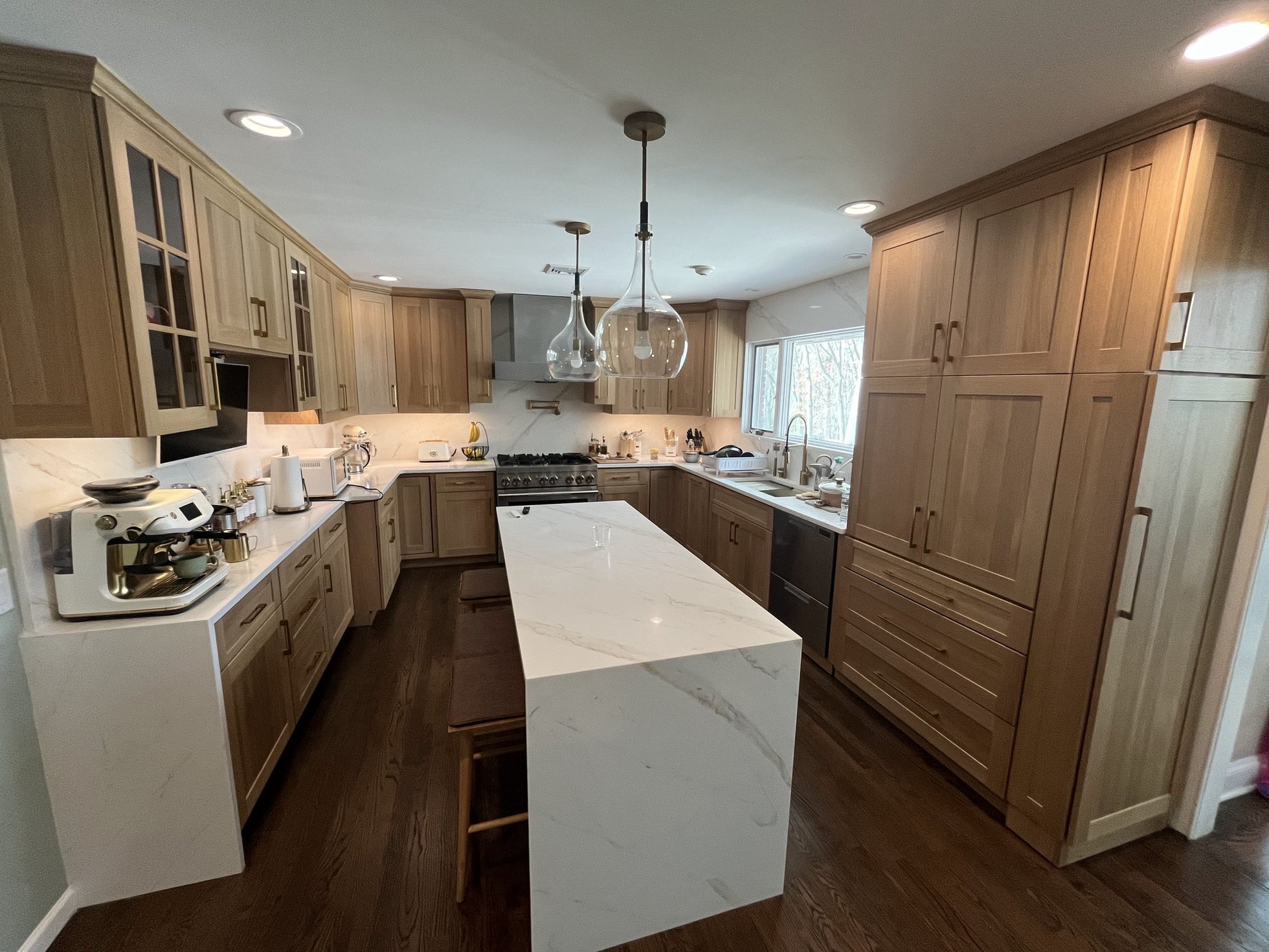 This kitchen transformation started from scratch—a completely gutted space ready for a fresh, modern vision! We designed and installed plenty of custom white oak cabinets to maximize storage and bring warmth to the room. At the center, a stunning white oak kitchen island with built-in storage and a sleek waterfall countertop anchors the space, combining beauty and functionality. Every detail was carefully considered to create a cohesive, contemporary look. By blending expert craftsmanship with thoughtful design, we delivered a kitchen that is bright, inviting, and perfectly tailored to the homeowner’s lifestyle—practical, elegant, and completely ready for everyday living.