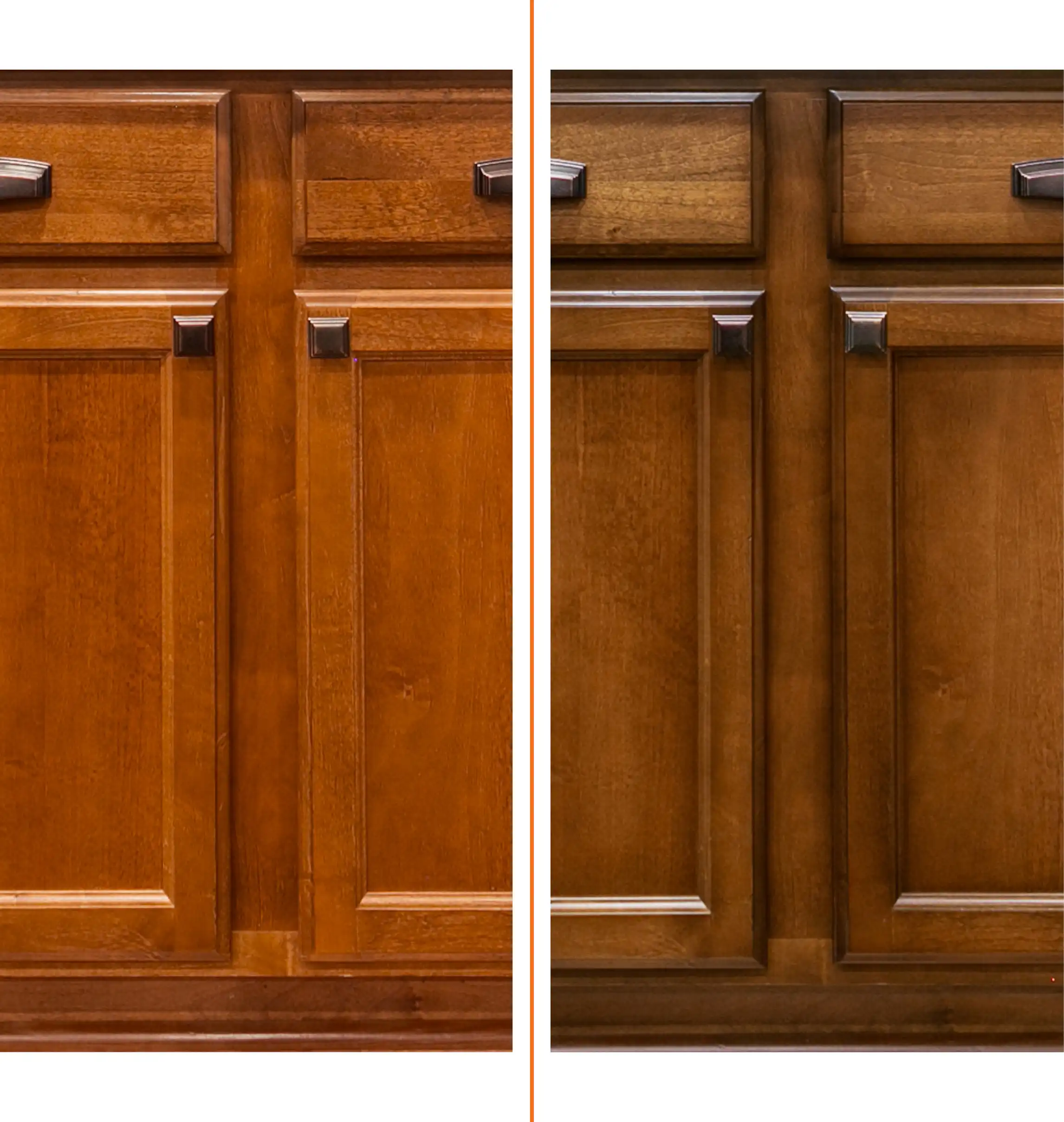 If you believe your kitchen’s aesthetic would be best preserved with a warmer, yet natural look for your oak cabinets, our Stain Color Change service is an ideal option. This service will not only remove any yellowing from prolonged sun exposure that may have occurred, but we’ll be able to uphold their current wood grain with a new stain. If you’re looking for a significantly darker wood finish, then our cabinet stain refinishing is exactly what you need.